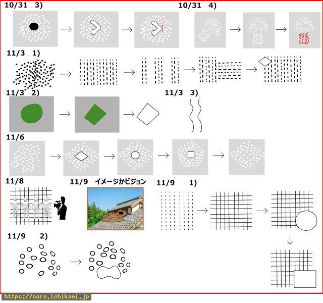 そこに白線のごく短いのや長いのや、白い帯状、ヒミさんのような形、半円、短い縦線、長い縦線など、次々現れ消えていく”